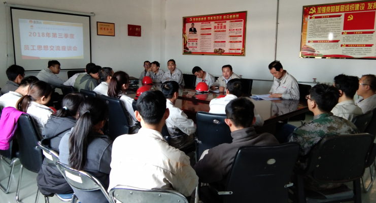 為了充分了解員工的思想動態,征詢廣大職工意見和建議,幫助員工解決工作和生活中的實際困難,加強員工隊伍建設,體現公司以人為本的管理理念,促進企業更加健康、和諧發展,寧夏興昊永勝鹽業科技有限公司于10月10日組織召開了2018年第三季度員工思想交流座談會。會議由鹽業公司總經理尚繼榮同志主持,鹽業公司黨支部副書記王志杰、綜合科科長張偉及職工代表列席參加會議。