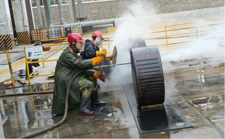 檢修已經是第三天,接近尾聲,大家似乎已經疲憊,但是行動上未松懈。今日的氯化氫小廣場上格外熱鬧,7:20,班長已經開始準備今日的檢修票證,為檢修項目做準備。他的身影在朝陽地映射下顯得那么著急,沒有一點怠慢的意思,今天我們班組檢修的項目是提濃塔再沸器石墨塊疏通工作,這項工作看起來簡單,實際上是耐心地考驗。一個個細小的石墨孔需要用蒸汽一個一個疏通,檢修開始之前還是和往常一樣,安全教育是少不了的,班長一遍遍強調防護用品規范佩戴以及疏通過程中的安全注意事項,在準備工作結束后,今天的檢修工作開始了。