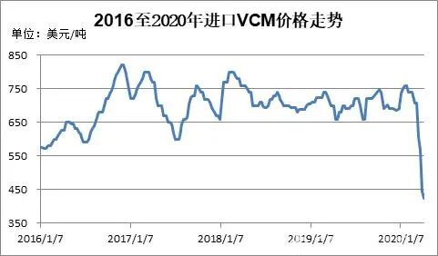 在需求增長和美國頁巖氣革命的推動下,近年來,全球乙烯行業進入新一輪擴能高峰期,供應趨向寬松,乙烯市場運行中樞下移。油價暴跌,乙烯的成本端支撐塌陷,乙烯市場加速下跌,乙烯法PVC的生產成本進一步下降。截至2020年4月上旬,亞洲乙烯CFR東北亞報405至415美元/噸,較年初下跌逾40%。全球VCM市場供需相對平衡,價格波動幅度較小。2018年至2020年初,亞洲乙烯CFR東北亞價格大體在650-800美元/噸之間震蕩。受油價下跌影響,VCM價格大跌,2020年4月上旬,亞洲乙烯CFR東北亞報423-425美元/噸,較年初下跌近40%。