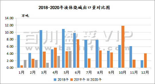 如圖所示,2018-2020年我國液堿出口量逐年下滑,2020年上半年受全球公共衛生事件影響,我國進出口貿易受到嚴重制約,液堿出口量同比下滑明顯,絕大部分貨源需轉向國內市場消化,國內市場消化情緒亦不佳,市場持續低迷。