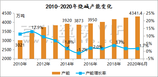 2016年在大宗原料價格開啟上漲通道后,中國燒堿產能增長率轉負為正。2020年6月末百川盈孚統計中國燒堿產能約4341.4萬噸。( 2015年大宗商品交易平臺價格的處于歷史最低水平,供給側改革降低了大宗商品交易平臺供給的彈性,使得價格暴漲成為可能)。