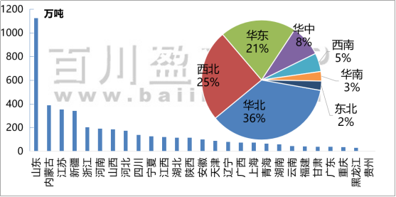 產能:增產集中地為江蘇、內蒙古、山東、河北、新疆地區,預計到2023年,中國燒堿產能約4600-4700萬噸,山東省燒堿產能將逼近1300萬噸,新疆維吾爾自治區燒堿產能有望突破400萬噸,江蘇、內蒙古及新疆三地燒堿生產能力旗鼓相當。