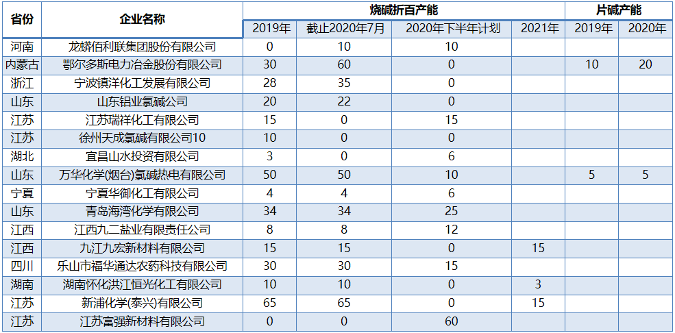 二、2020年燒堿產能變化情況