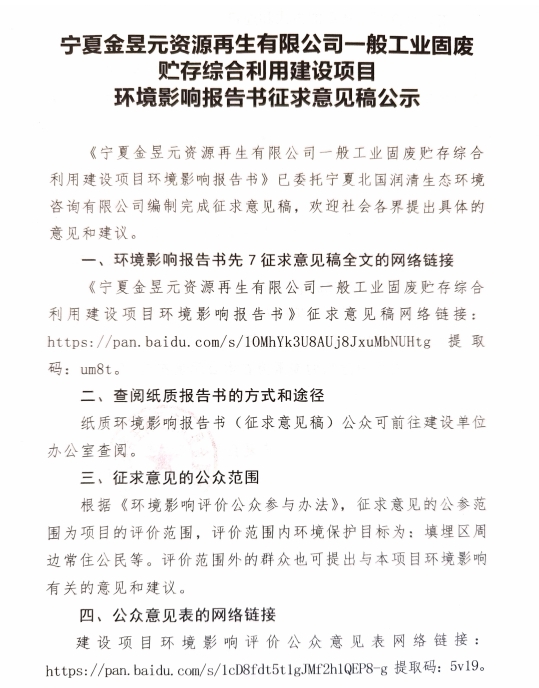 寧夏金昱元資源再生有限公司一般工業固廢貯存綜合利用建設項目征求意見稿公示