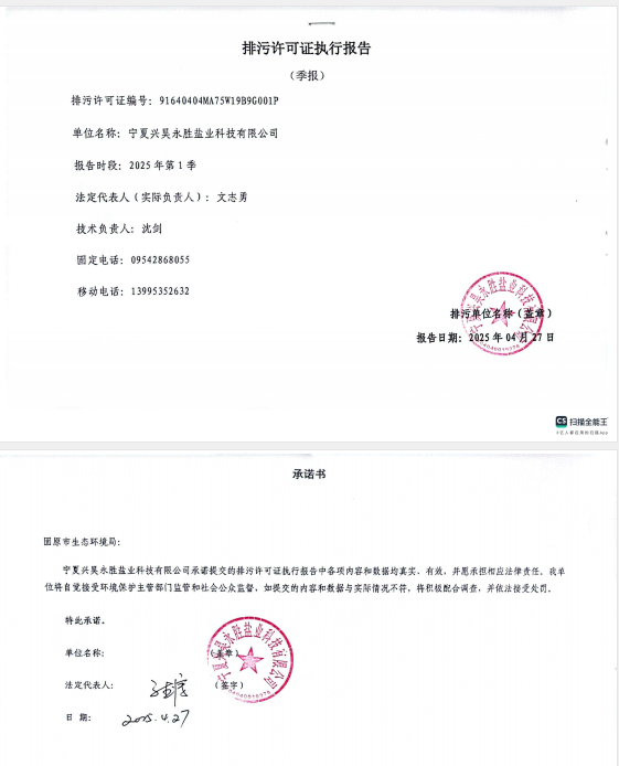 寧夏興昊永勝鹽業科技有限公司2025年第1季度排污許可執行報告